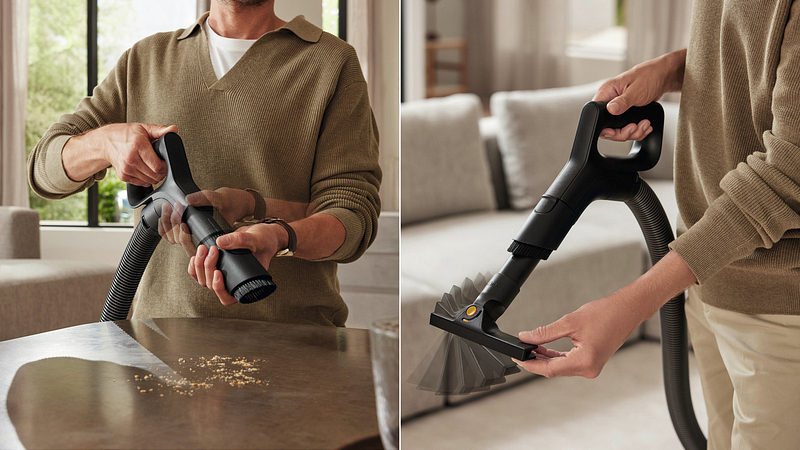 •   Accessoire 2-en-1 : Brosse à coussin et suceur plat
